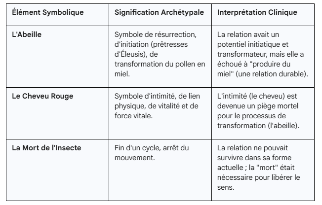 Vézina ancre la théorie dans sa propre expérience clinique et personnelle pour démontrer la subtilité du décodage symbolique. Il relate sa relation avec “Bérénice”, une femme rencontrée virtuellement, marquée par une méfiance mutuelle et une dynamique de “butinage” relationnel.1 Au moment de la rupture, alors qu’il devait choisir entre sa carrière à Québec et cette relation incertaine, une abeille est entrée dans sa chambre et est morte. Plus tard, il a retrouvé l’insecte enroulé dans un long cheveu rouge appartenant à Bérénice.